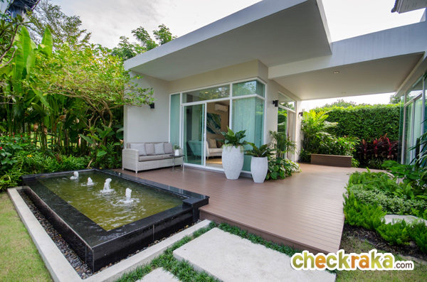 มีที่นั่งพักผ่อนหย่อนใจ จะเห็นว่าด้านในเป็นสระว่ายน้ำ