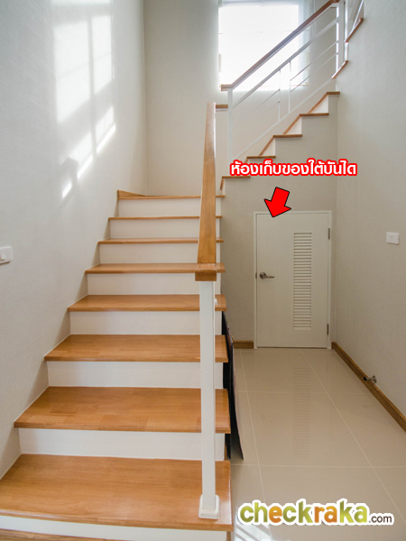 ห้องเก็บของใต้บันได มีไฟด้านใน พร้อมประตูปิดเรียบร้อย ตัวบันไดโครงสร้างคอนกรีตเสริมเหล็ก