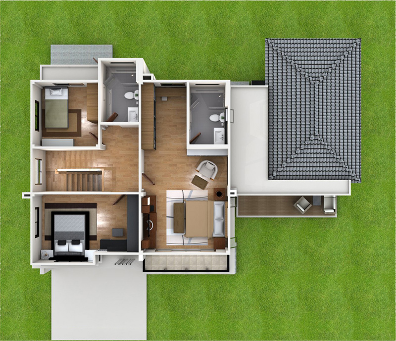 ขึ้นมาที่ชั้น 2 จะเจอกับฟังก์ชั่นห้องตามนี้เลยค่ะ พื้นชั้นนี้เป็นพื้นลามิเนต ความสูงเท่ากับชั้นล่างค่ะ