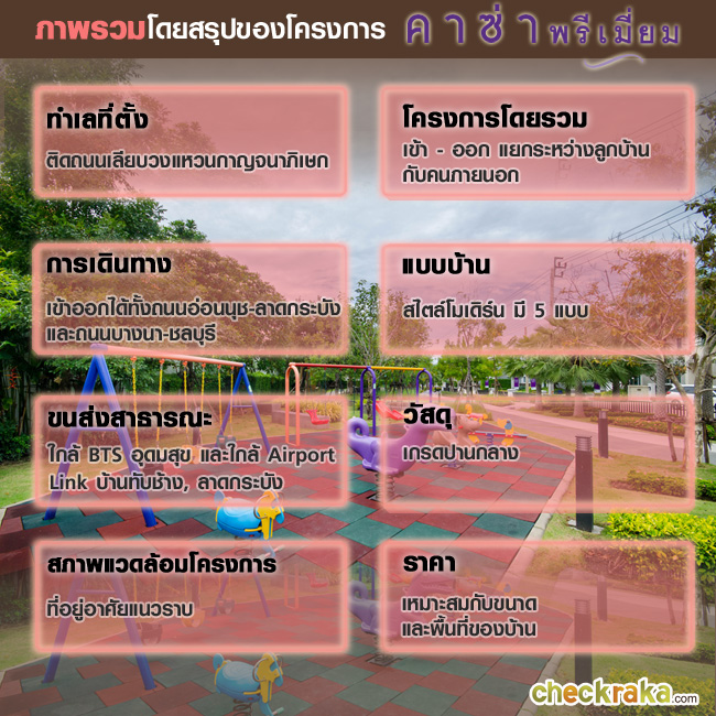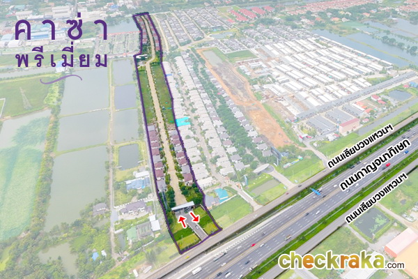 โครงการ คาซ่า พรีเมี่ยม อ่อนนุช - วงแหวน (Casa Premium Onnuch - Wongwhaen) เป็นโครงการบ้านเดี่ยว สไตล์ Modern 2 ชั้น ตั้งอยู่ถนนเลียบวงแหวนกาญจนาภิเษก มีจำนวนบ้านรวมทั้งหมด 134 หลัง สร้างอยู่บนพื้นที่โครงการขนาด 39 ไร่ ลักษณะโครงการเป็นสี่เหลี่ยมแนวยาว ภายในมีสิ่งอำนวยความสะดวกครบครัน ทั้งคลับเฮ้าส์ ฟิตเนส สระว่ายน้ำ และสวนสาธารณะขนาด 1ไร่เศษ มีเลนวีลแชร์สำหรับผู้สูงวัยและสนามเด็กเล่น ซึ่งตั้งอยู่ช่วงกลางของโครงการ รั้วรอบโครงการสูง 3 เมตร ถนนหลักกว้าง 14 เมตร ส่วนถนนในซอยกว้าง 9 เมตร มี Sale Office ตั้งอยู่หลังแรกฝั่งซ้ายมือ มองเห็นได้ชัดเจน ส่วนประตูโครงการมีซุ้มประตูเข้า-ออกหลักเพียงทางเดียวค่ะ