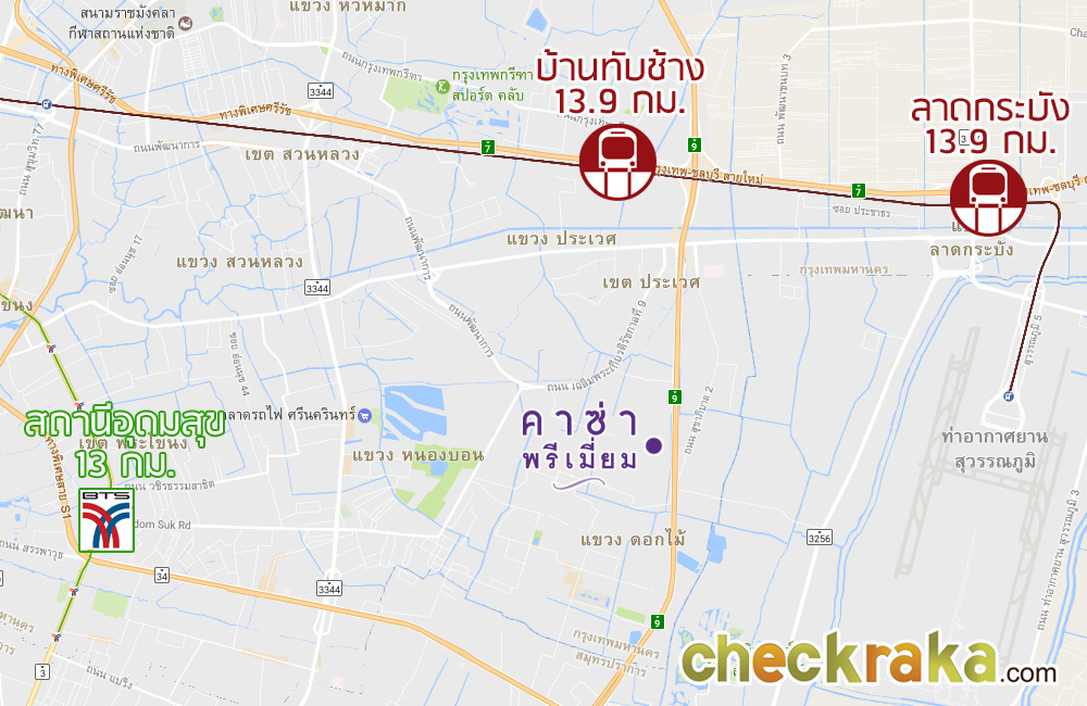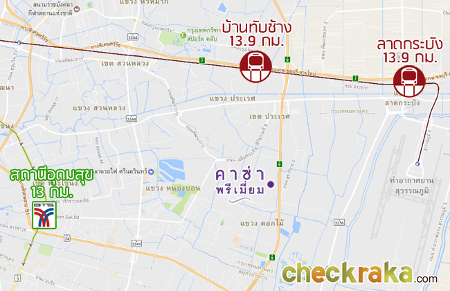 การเดินทางด้วยรถไฟฟ้า BTS สถานีที่ใกล้โครงการที่สุด คือ สถานีอุดมสุข (ระยะทางห่างจากโครงการประมาณ 13 กม.) ส่วน Airport Rail Link สามารถใช้ได้ 2 สถานีค่ะ คือ สถานีบ้านทับช้าง (ระยะทางห่างจากโครงการประมาณ 13.9 กม.) และ สถานีลาดกระบัง (ระยะทางห่างจากโครงการประมาณ 13.9 กม.)