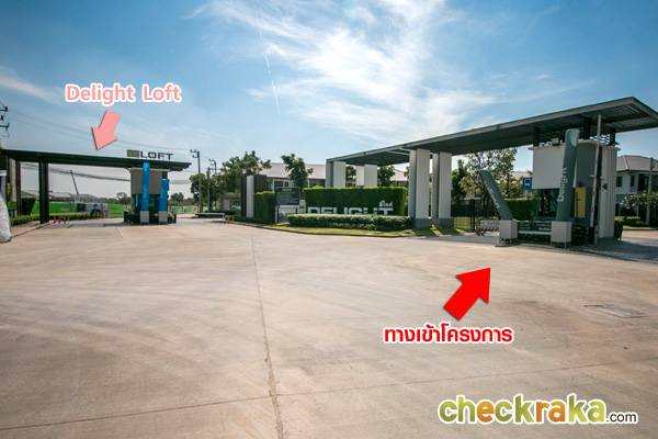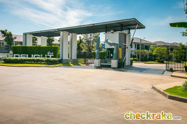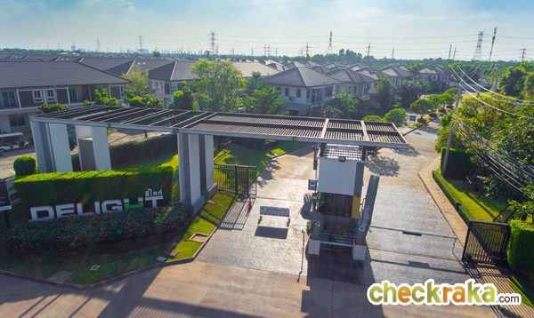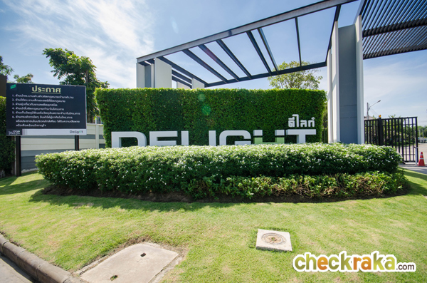 ซุ้มประตูโครงการมีขนาดใหญ่ แยกทางเข้า-ออกชัดเจน มีป้ายชื่อ Delight อยู่ฝั่งซ้ายมือ