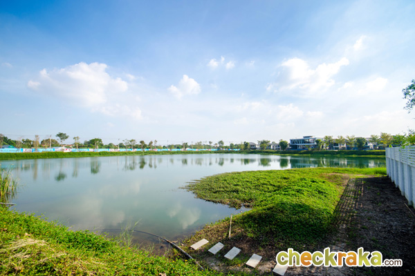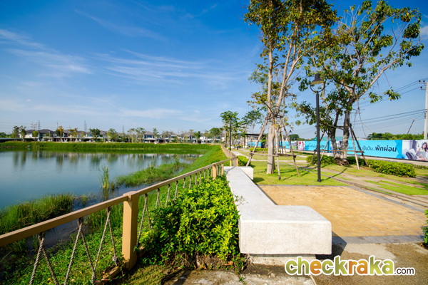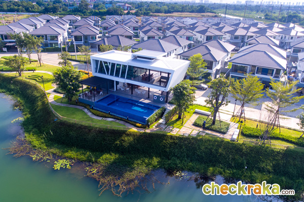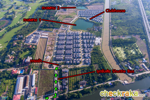 แสดงให้เห็นถึงภาพรวมของโครงการข้างๆ บ้าน คลับเฮ้าส์ ทะเลสาบ สวนและถนนหลัก