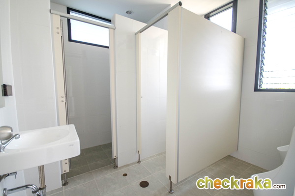 ส่วนพื้นห้องน้ำก็ลดลงอีกเล็กน้อย ภายในห้องน้ำมีหน้าต่างบานกระทุ้งให้ 1 บาน ให้สุขภัณฑ์มาครบ ทั้งอ่างล้างหน้า