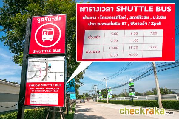 ออกจากโครงการมา จะเป็นทางลึกตรงออกไป มีจุดรับ-ส่ง รถ Shuttle Bus อยู่ด้านซ้ายมือ