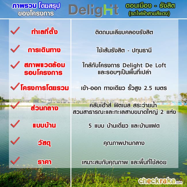 สวัสดีค่ะ วันนี้ CheckRaKa.com จะพาทุกท่านไปเยี่ยมชม โครงการ "ดีไลท์ ดอนเมือง - รังสิต (รถไฟฟ้าสายสีแดง) (Delight Donmuang-Rangsit)" ซึ่งเป็นบ้านเดี่ยวแนวคิดใหม่ กับบ้านใหม่ดีไซน์โมเดิร์น ของ บริษัท พฤกษา เรียลเอสเตท จำกัด (มหาชน) ตัวโครงการอยู่ไม่ไกลจากรถไฟฟ้าสายสีแดง (บางซื่อ-รังสิต) ตลอดจนบรรยากาศภายในโครงการที่มีทั้งคลับเฮ้าส์ริมทะเลสาบขนาดใหญ่ พร้อมห้อง Fitness สระว่ายน้ำ และสวนส่วนกลางสำหรับการพักผ่อน รายละเอียดจะน่าสนใจแค่ไหน ลองไปชมโครงการกันเลยค่ะ