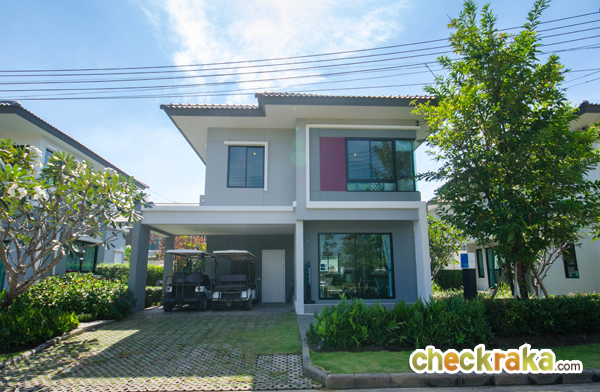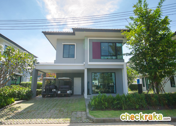 บ้านตัวอย่างลานจอดรถจะใช้เป็นที่จอดรถกอล์ฟ มีหลังคากันแดดฝนให้ส่วนนึง ลงเสาเข็มให้ลึกเท่าตัวบ้าน