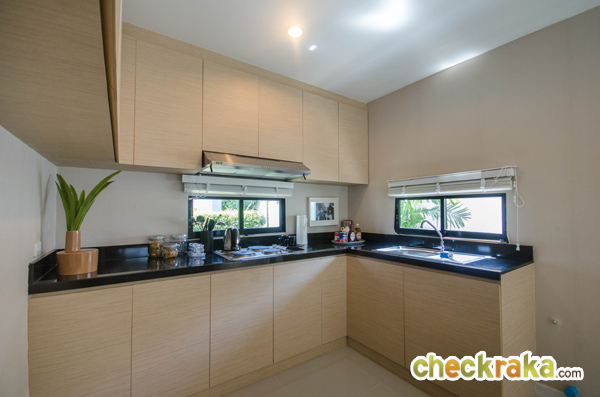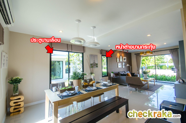 บ้านตัวอย่างตกแต่งเคาน์เตอร์ตัว L มาให้ดูเป็นตัวอย่าง ภายในมีหน้าต่างบานเลื่อนให้ 2 บานสำหรับเปิด