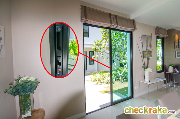 ประตูบานเลื่อนเปิดออกไปข้างบ้านได้ และพื้นตรงประตูมีเฉลียงยื่นออกไปเล็กน้อย จะได้เดินเข้า-ออกได้สะดวกขึ้น
