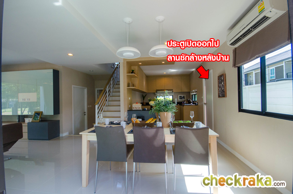 ตรงข้ามส่วนรับประทานอาหารจะเป็นครัวเปิดค่ะ ตรงครัวจะมีประตู PVC เปิดออกไปลานซักล้างหลังบ้านได้