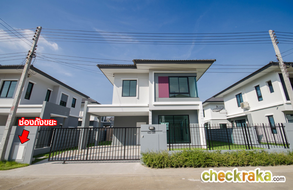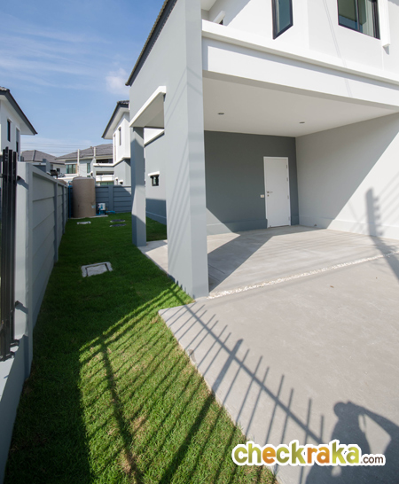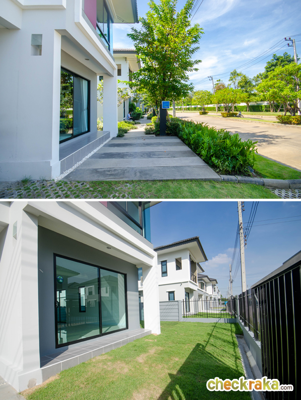 บ้านตัวอย่างแบบบ้านเปล่า ตัวบ้านสร้างแบบ Precast สำหรับบ้านที่ขายและใช้ส่งมอบลูกค้าจะเป็นบ้านเปล่า ไม่ได้ตกแต่งเฟอร์นิเจอร์ แต่ตัวบ้านจะปูหญ้าให้เต็มพื้นที่ว่าง มีประตูบานเลื่อนเหล็กแบบโปร่ง รั้วระหว่างบ้านมีความสูง 1.5 เมตร