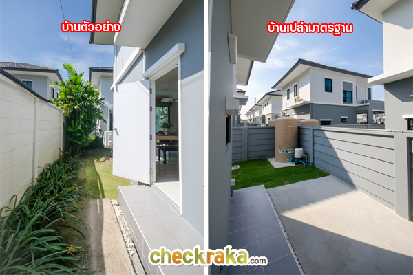 พื้นที่ด้านหน้าบ้าน เปรียบเทียบกันระหว่างบ้านตัวอย่าง กับบ้านเปล่ามาตรฐาน