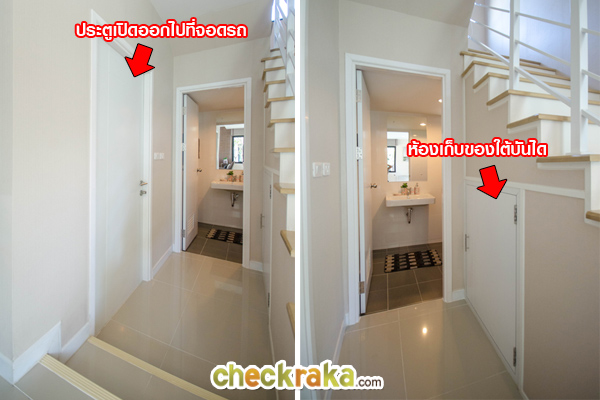 ตรงทางเดินเข้าห้องน้ำมีประตูที่สามารถเปิดออกไปโรงจอดรถได้ ส่วนฝั่งตรงข้ามกันเป็นห้องเก็บของใต้บันไดค่ะ