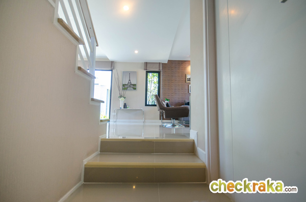 บ้านตัวอย่างพร้อมตกแต่ง ตรงประตูทางเข้าหลักของบ้าน ตัวพื้นบ้านจะสูงขึ้นมาจากถนนและพื้นด้านนอก