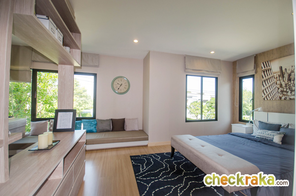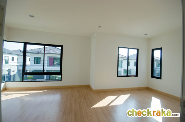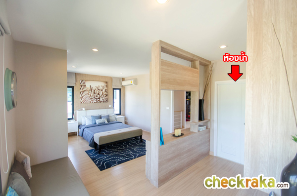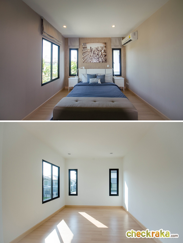 เปรียบเทียบกับระหว่างบ้านตัวอย่างกับบ้านเปล่า มุมนี้เมื่อจัดวางเตียงขนาดใหญ่แล้ว ยังมีพื้นที่เหลือพอวาง