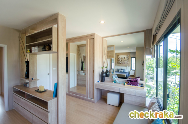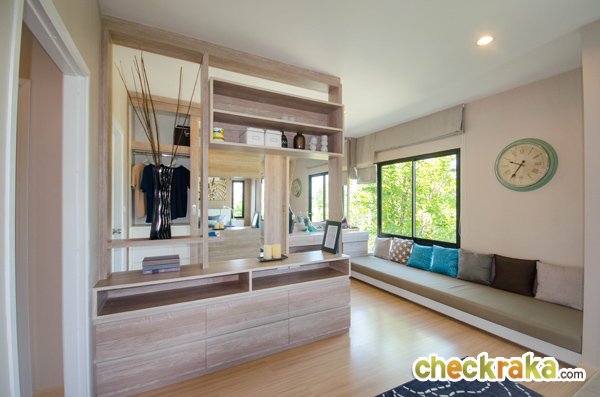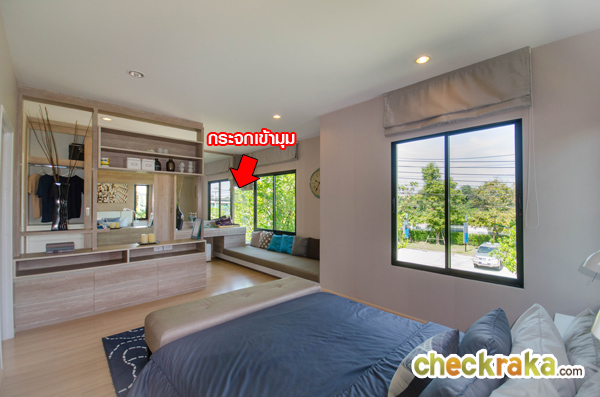 สุดผนังยังสามารถจัดวางตู้เสื้อผ้าขนาดใหญ่ และโต๊ะเครื่องแป้งได้พอดี ส่วนหน้าต่างบานเลื่อนและกระจกเข้ามุม