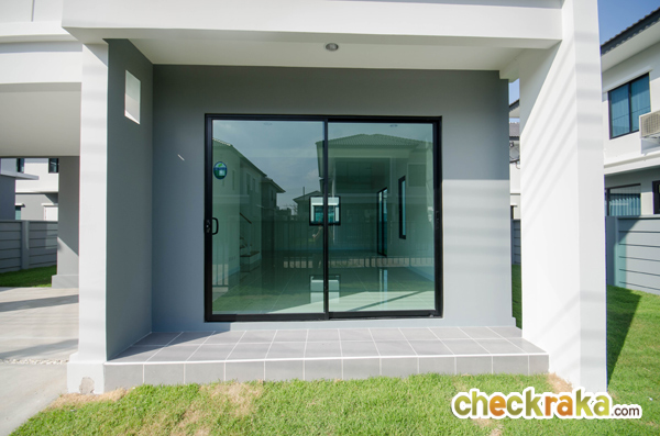 เฉลียงด้านหน้าบ้านจะยกสเต็ปขึ้นมาให้ 1 สเต็ปเพื่อความสะดวก ปูด้วยกระเบื้องสีเทา ประตูบานเลื่อน