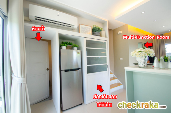 ที่เห็นนี้ทางโครงการตกแต่งเพิ่มขึ้นมา ให้เป็นโซนเก็บของ วางตู้เย็น ช่วยเพิ่มพื้นที่ใช้สอยภายในบ้านด้วยค่ะ