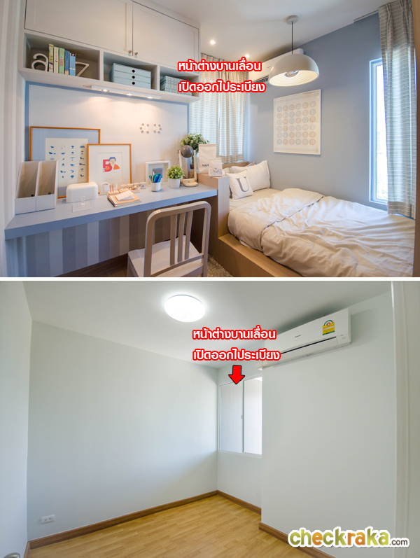 Multi-Function Room หรือห้องอเนกประสงค์ เปรียบเทียบให้ดูกันระหว่างบ้านตัวอย่างกับบ้านเปล่า ห้องนี้บ้านตัวอย่าง