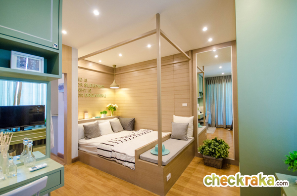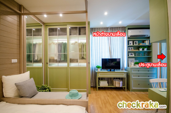 พื้นที่ปลายเตียงจะจัดวางตู้เลื้อผ้า โต๊ะวางทีวี ชั้นวางของ และมีหน้าต่างบานเลื่อนเปิดระบายอากาศได้