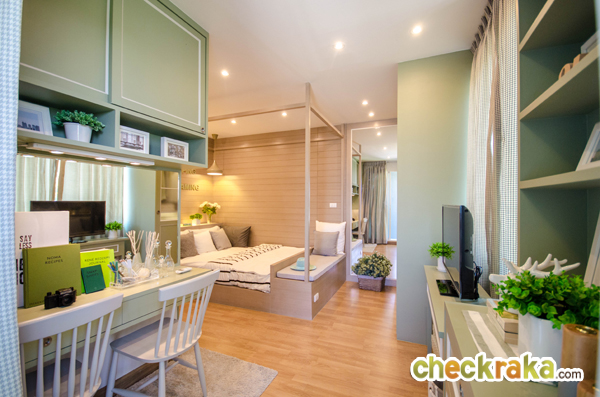 สามารถวางเตียงขนาด 3.5 ฟุต ตู้เสื้อผ้า และโต๊ะอ่านหนังสือได้พอดี ตรงหัวเตียงคือหน้าต่างบานเลื่อนที่