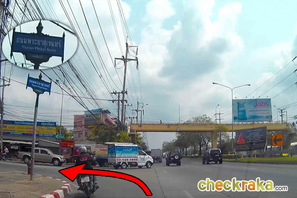 ตรงไปจนเจอแยกลำกะโหลกให้เลี้ยวขวาเข้าถนนพระยาสุเรนทร์