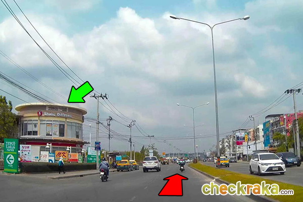 ตรงเข้าไปในถนนพระยาสุเรนทร์ ประมาณ 2.6 กม. จะผ่าน Tesco Lotus ให้เตรียมชิดขวาเพื่อกลับรถ