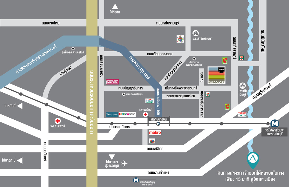 โครงการ เดอะคัลเลอร์ส พรีเมี่ยม วงแหวน - รามอินทรา ตั้งอยู่บนถนนสุเหร่าคลองหนึ่ง (ซอย 15) แขวงบางชัน เขตคลองสามวา กรุงเทพมหานคร 10510 10510 สามารถเชื่อมต่อถนนสายหลักได้ 4 เส้นทาง ทั้งจากถนนรามอินทรา เข้าทางรามอินทรา 109 หรือรามอินทรา 117 ถนนปัญญาอินทรา และถนนหทัยราษฎร์ โดยที่ตั้งของโครงการใกล้กับทางด่วนวงแหวนกาญจนาภิเษก และทางด่วนรามอินทรา-อาจณรงค์ สามารถเดินทางได้อย่างสะดวก อยู่ใกล้กับห้าง fashion island และอยู่ไม่ห่างจากใจกลางเมือง