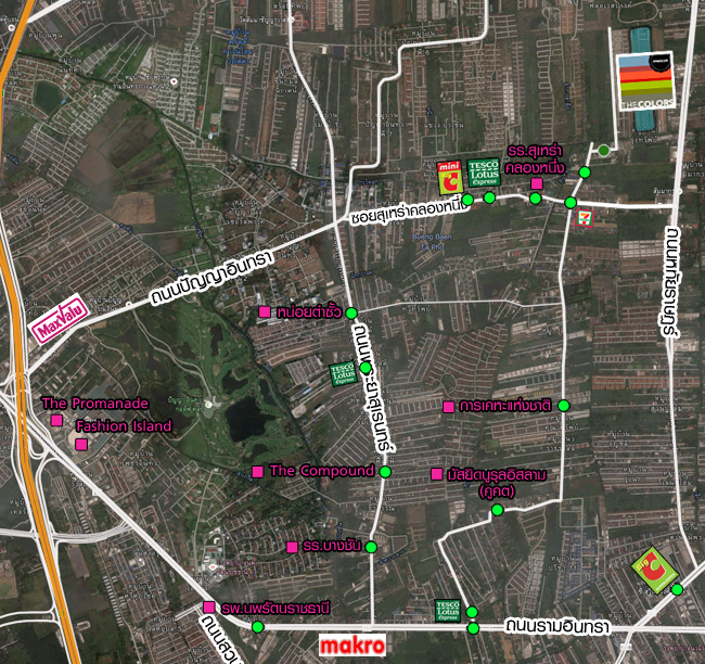 เริ่มต้นบริเวณถนนรามอินทรา ตรงมาเรื่อยๆ จะผ่าน Fashion Island
