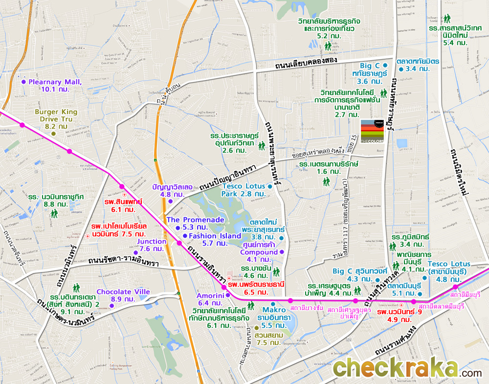 แผนที่แสดงแต่ละสถานีของรถไฟฟ้าสายสีชมพู ช่วงแคราย-มีนบุรี