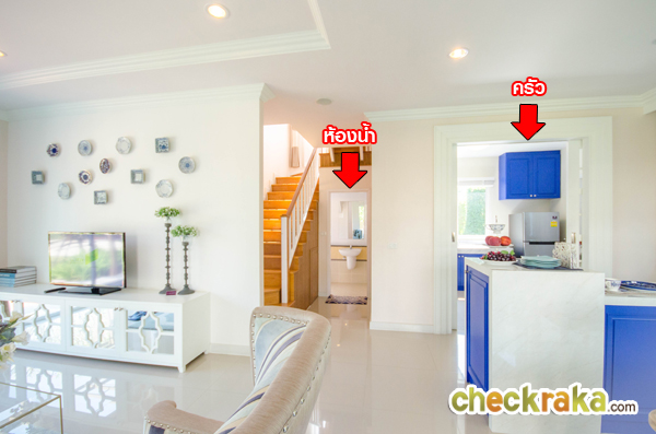 จากมุมนี้จะเห็นฟังก์ชั่นบ้านพร้อมทางขึ้นบันไดไปชั้น 2 ติดกันคือห้องน้ำ ถัดจากนั้นเป็นทางเข้าห้องครัวค่ะ