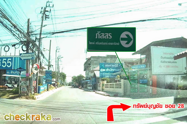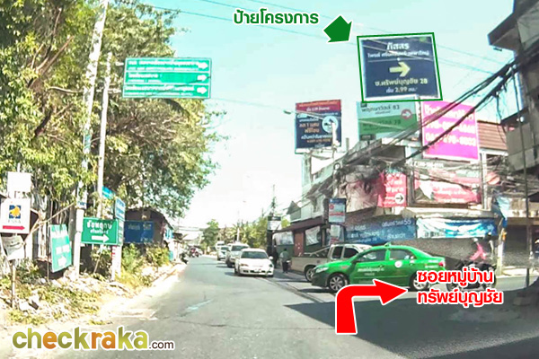 จากนั้นตรงเข้ามาอีก 1.1 กม. จะเจอซอยทรัพย์บุญชัย 28 ด้าหน้ามีป้ายบอกหมู่บ้านหลายๆ หมู่บ้าน