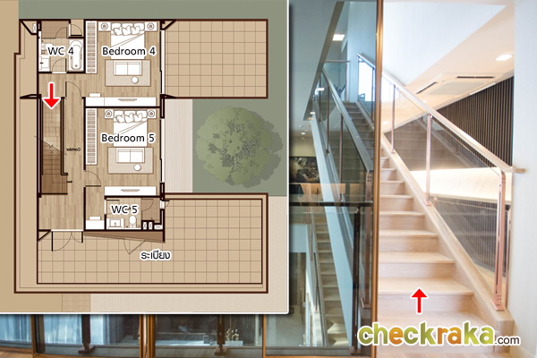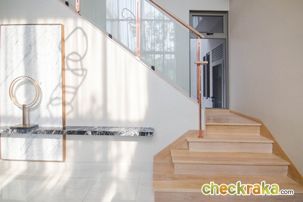 บันไดขึ้นชั้นบน โครงสร้างคอนกรีตเสริมเหล็ก ปูพื่้นไม้ลามิเนต มีกระจกนิรภัยกั้นกันตก