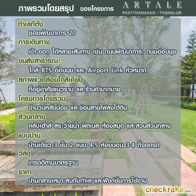 สวัสดีค่ะ สำหรับวันนี้ CheckRaka.com จะพาทุกท่านไปเยี่ยมชมบ้านเดี่ยวระดับลักซ์ชัวรี่โครงการใหม่ล่าสุด ของ บริษัท อนันดา ดีเวลลอปเม้นท์ จำกัด (มหาชน) โครงการที่ว่านี้ คือ "อาเทลล์ พัฒนาการ - ทองหล่อ (Artale Pattanakarn - Thonglor)" กับบ้านเดี่ยวที่ห่างจากทองหล่อเพียง 3.5 กม.ภายใต้แนวคิด ART (Imagination) + TALE (Life Stage) คือการออกแบบพื้นที่ที่ผสานกันระหว่างศิลปะและฟังก์ชั่นที่ลงตัว ที่มีจุดเด่นตรงที่สวนสวยกลางบ้าน (Private Courtyard) ให้คุณได้ใกล้ชิดธรรมชาติได้ส่วนตัวมากขึ้น ตลอดจนบรรยากาศภายในโครงการที่มีทั้งคลับเฮ้าส์ ห้อง Fitness สระว่ายน้ำ ห้องสมุด และสวนส่วนกลางสำหรับการพักผ่อน แค่เกริ่นนำก็น่าสนใจแบบนี้ ลองไปชมรายละเอียดโครงการกันเลยค่ะ