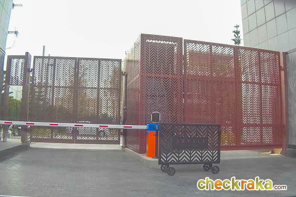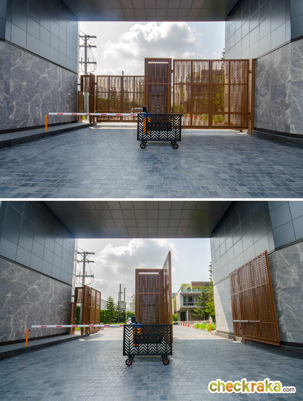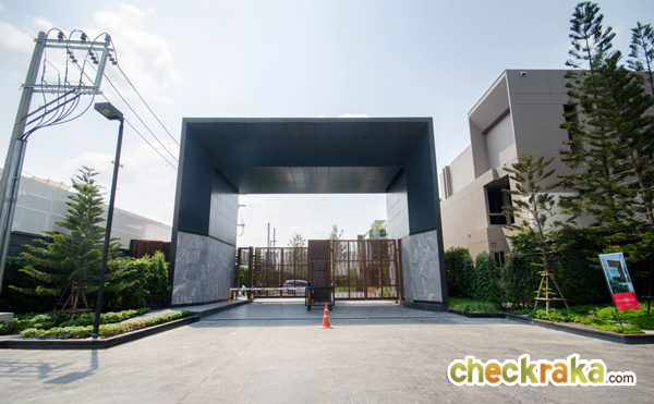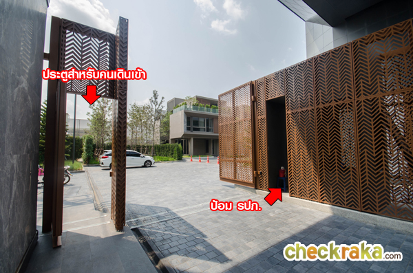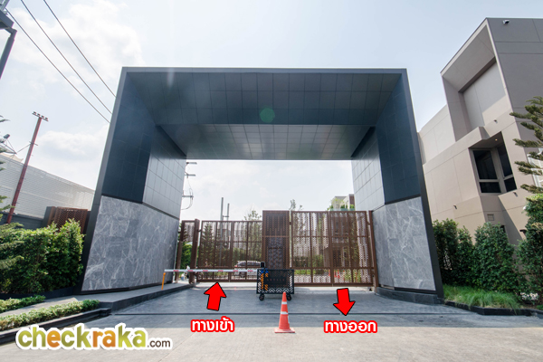 ซุ้มประตูทางเข้า-ออกหลักของโครงการมีขนาดใหญ่ มีหลังคากันแดด-ฝนให้ ด้วยลายหินอ่อนตัดกันกับโทนสีดำ