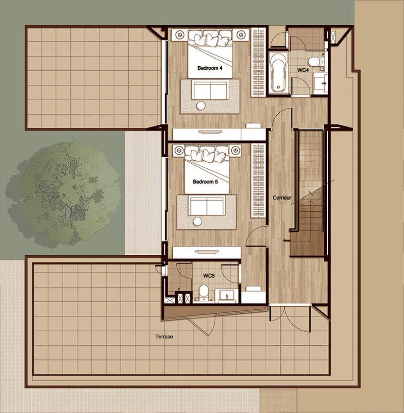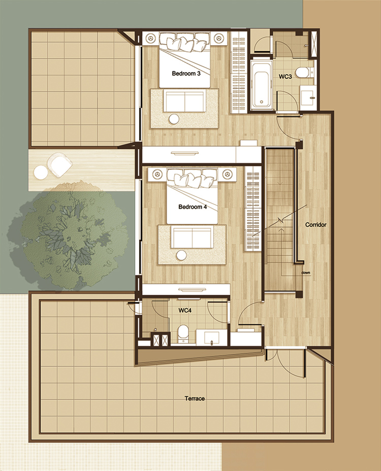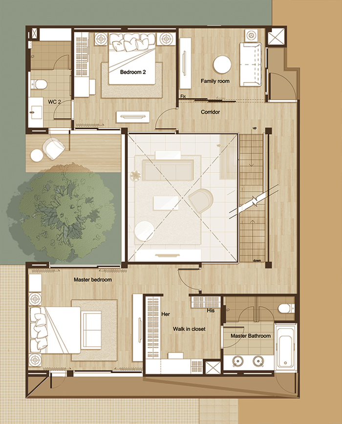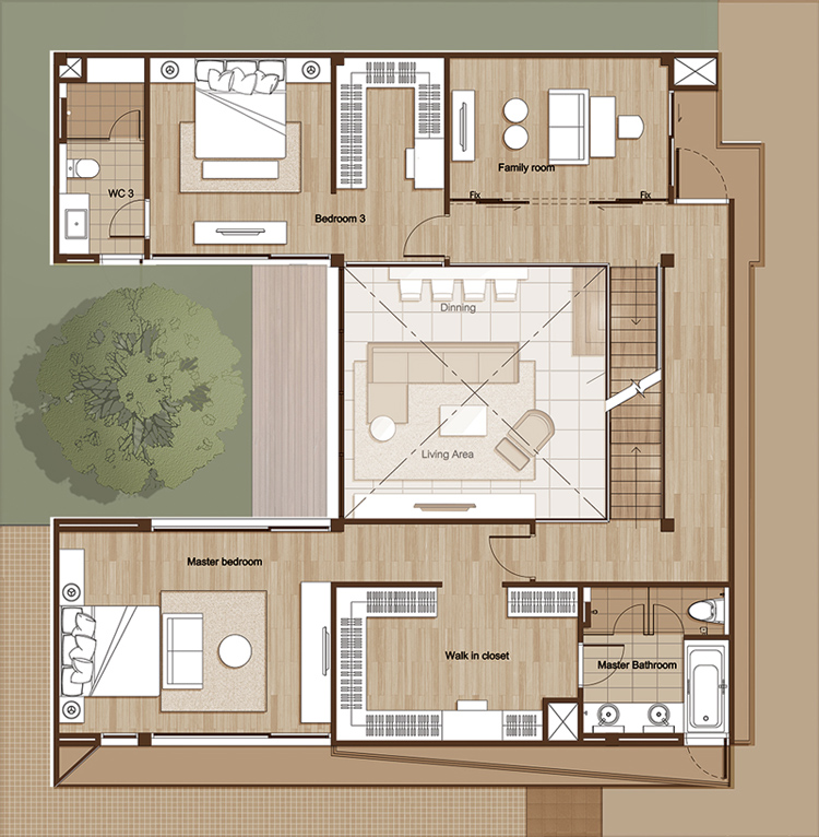 ขึ้นไปชั้นบนกันค่ะ จากแปลนบ้านจะเห็นว่า ชั้นสองประกอบไปด้วย Master Bedroom, ห้องนอน 3, และ Family Room