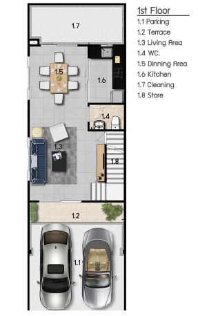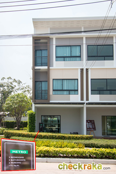 1) แบบบ้าน METRO - ทาวน์โฮม 3 ชั้น หน้ากว้าง 5 เมตร ขนาดที่ดินเริ่มต้น 19.40 ตารางวา มีพื้นที่ใช้สอย 175 ตารางเมตร ประกอบไปด้วย 3 ห้องนอน 3 ห้องน้ำ 1 พื้นที่รับแขก 1 ห้อง Family ห้องครัว และจอดรถได้ 2 คัน
