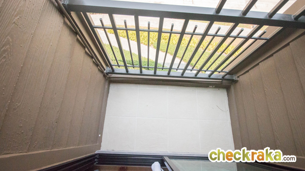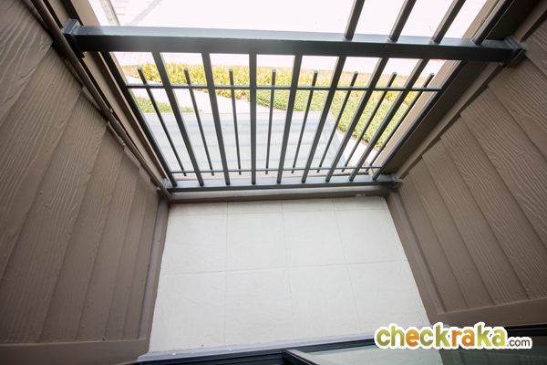 ระเบียงขนาดพอเหมาะ มีราวเหล็กกันตกสีดำกั้นไว้