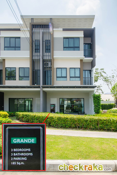 2) แบบบ้าน GRANDE - ทาวน์โฮม 3 ชั้น หน้ากว้าง 5.65 เมตร ขนาดที่ดินเริ่มต้น 20.5 ตารางวา มีพื้นที่ใช้สอย 185 ตารางเมตร ประกอบไปด้วย 3 ห้องนอน 3 ห้องน้ำ 1 พื้นที่รับแขก Family Area ห้องครัว และจอดรถได้ 2 คัน