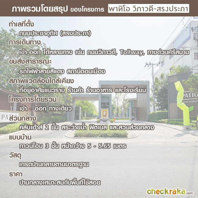 โครงการ พาทิโอ วิภาวดี - สรงประภา (Patio Vibhavadi - Songprapa) เป็นโครงการพรีเมียมทาวน์โฮม สไตล์โมเดิร์น ขนาด 3 ชั้น มีทางเข้า-ออกหลักเพียงทางเดียว ตรงหน้าถนนประชาอุทิศ สร้างอยู่บนแปลงที่ดินขนาด 18-0-52.9 ไร่ มีบ้านทั้งหมด 183 ยูนิต มีพื้นที่สีเขียวเป็นสวนสาธารณะ พร้อมสนามเด็กเล่น และ Jogging Track อยู่ช่วงกลางของโครงการ นอกจากนี้ยังมีสิ่งอำนวยความสะดวกครบครัน ทั้ง Club house 2 ชั้น พร้อมสระว่ายน้ำระบบเกลือ และฟิตเนส แปลนโครงการมีลักษณะเป็นสี่เหลี่ยมผืนผ้าแนวยาว แบ่งเป็น 2 ช่วงตามรูปด้านบน รั้วรอบโครงการมีความสูงอยู่ที่ 2.6 เมตร มีถนนหลักกว้าง 12-10 เมตรตามลำดับความลึก และถนนภายซอยที่ลึกเข้าไปด้านในกว้าง 9 เมตร