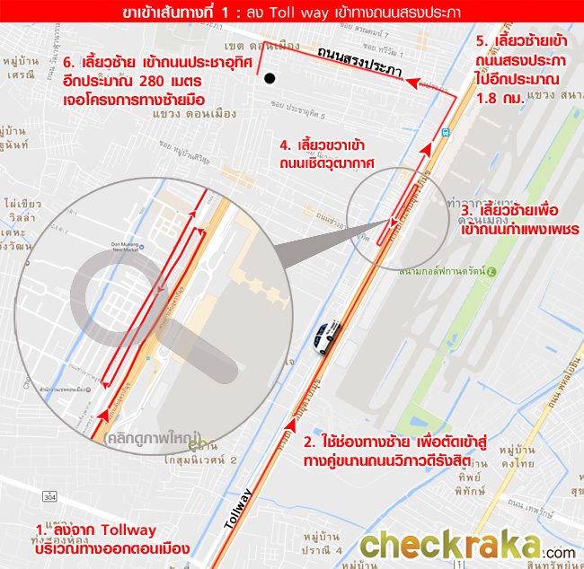 ขาเข้าโครงการ เส้นทางที่ 1 มาจากทางยกระดับอุตราภิมุข (โทลล์เวย์) เข้าถนนสรงประภา