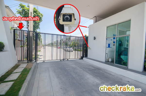 ตรงซุ้มประตูทางเข้ามี รปภ. ตลอด 24 ชม. ประตูบานเลื่อนเหล็ก CCTV และมีห้องสำหรับรปภ. กั้นตรงกลาง