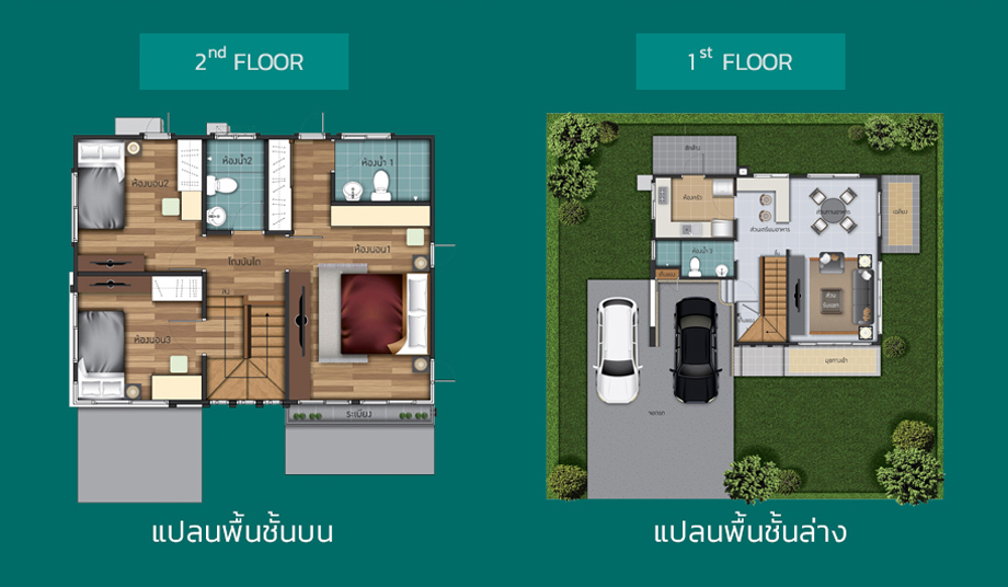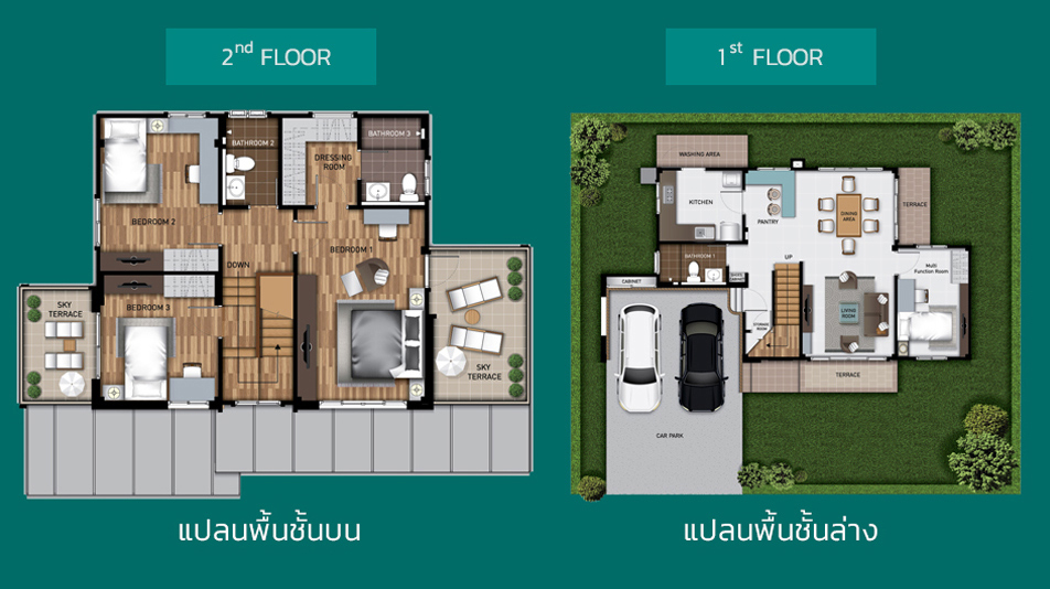 1. แบบบ้าน Moline Plus T3+ (B) - บ้านเดี่ยว 2 ชั้น พื้นที่ใช้สอย 193 ตารางเมตร ขนาด 3 ห้องนอน 3 ห้องน้ำ 2 ที่จอดรถ 1 Multi-Finction Room 2 Sky Terrace ระเบียงส่วนตัวขนาดใหญ่ พร้อม Panoramic View