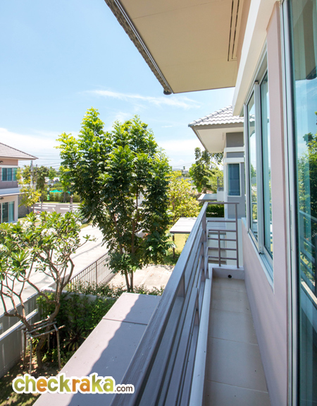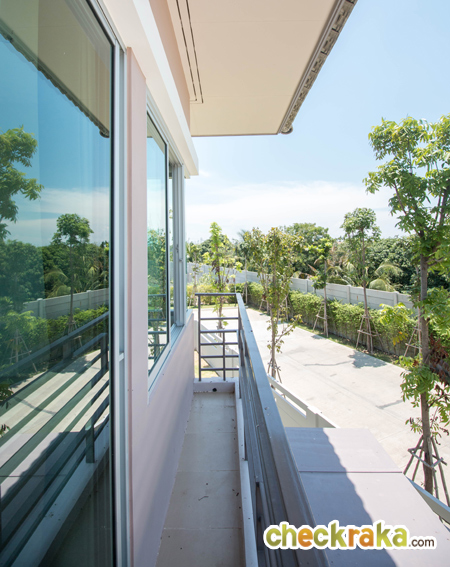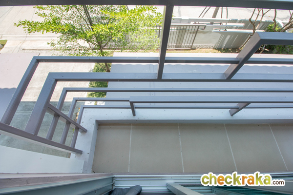 พื้นระเบียงปูด้วยกระเบื้อง ราวกันตกเป็นราวเหล็กทาสี ความยาวระเบียงเท่ากับความกว้าง