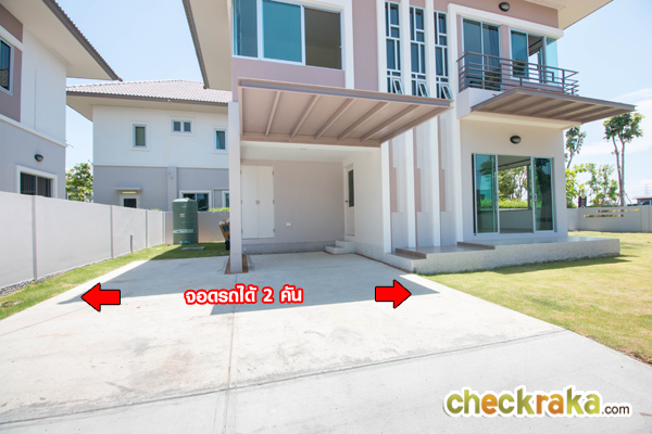 พื้นที่จอดรถสามารถจอดรถได้ 2 คัน มีหลังคากันสาดยาวออกมาให้จอดรถในร่มได้ 1 คัน