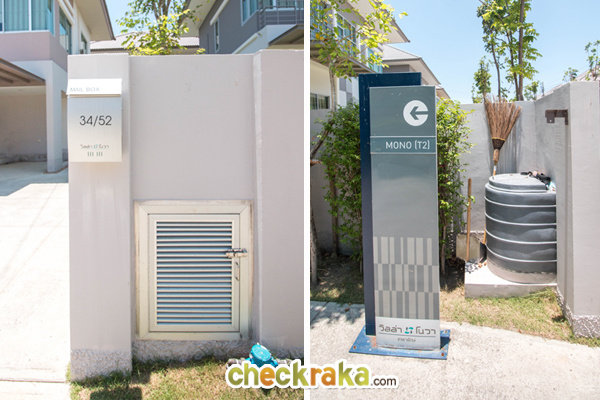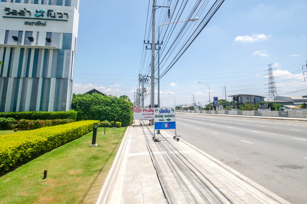 ฝั่งขวามือจัดเป็นสวนหย่อมและดูแลตกแต่งอย่างดี พร้อมป้ายชื่อโครงการ วิลล่า โนวา เทพารักษ์ ขนาดใหญ่