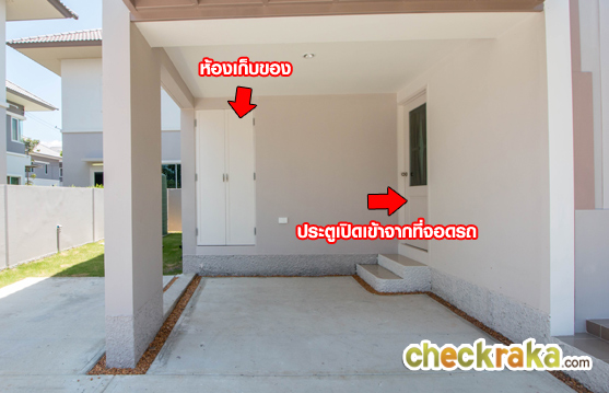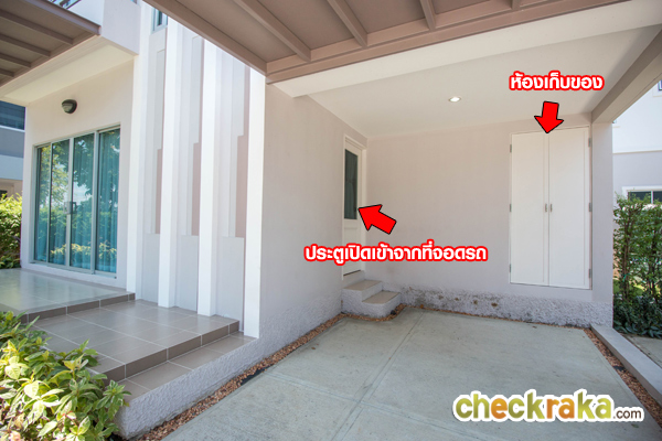ทางเข้าบ้านสามารถเข้าได้ 2 ทาง คือเข้าจากประตูตรงที่จอดรถ แล้วเข้าได้จากประตูบานเลื่อนที่เป็นทางเข้าหลัก