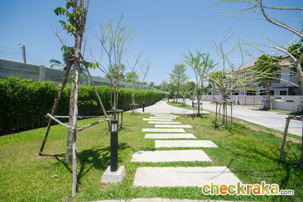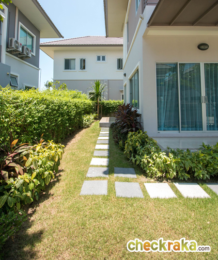 ด้านหน้าบ้านตัวอย่างจะปูหญ้า จัดสวน ลงต้นไม้และทำทางเดินมาให้