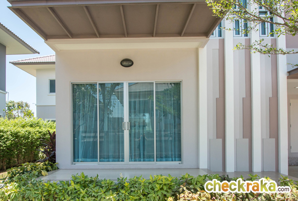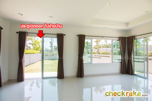 ประตูบานเลื่อนเปิดออกไปข้างบ้านได้ และพื้นตรงประตูมีเฉลียงยื่นออกไปเล็กน้อย จะได้เดินเข้า-ออกได้สะดวกขึ้น