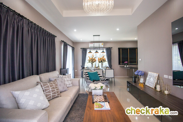 ตรงข้ามโซฟารับแขกคือพื้นที่สำหรับจัดวางทีวี ซึ่งระยะทีวีถึงชุดรับแขกประมาณ 2 เมตรกว่าๆ สามารถวางทีวี